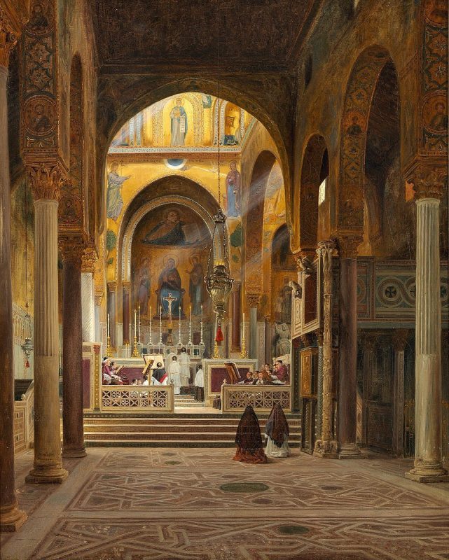 Il Palazzo dei Normanni, cuore del potere fin dall’età altavilliana, rappresentò per Federico II un luogo della memoria e della formazione. Cresciuto in quegli ambienti, il giovane sovrano respirò fin da subito l’atmosfera cosmopolita che avrebbe caratterizzato la sua corte. Delle torri medievali rimangono la Pisana e la Joharia: quest’ultima custodisce la Sala di Ruggero, un vero microcosmo di mosaici bizantini con animali fantastici, scene di caccia e simboli di potere che fondono Oriente e Occidente.